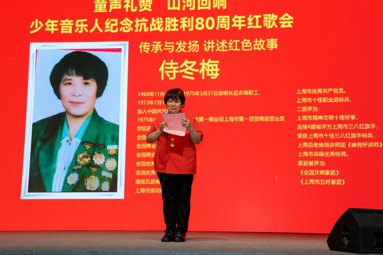 劳模代表侍冬梅登台分享,高度肯定“少年音乐人纪念抗战胜利80周年红歌会”的深远意义,并殷切寄语青少年:“要扣好人生第一粒纽扣”,让奋斗精神在年轻一代中扎根。
