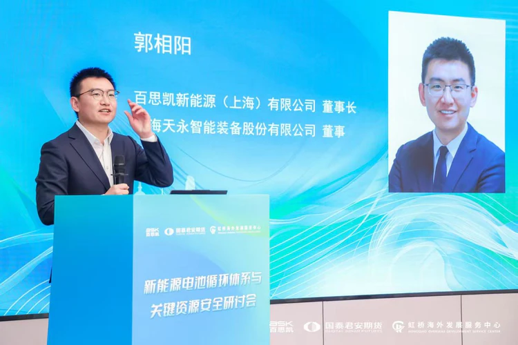 在随后的主题演讲环节,百思凯新能源(上海)有限公司董事长、上海天永智能装备股份有限公司董事郭相阳率先以《从锂资源到锂循环:构建新能源时代的再生基础设施》为题发表演讲。他深刻剖析了全球锂资源供给的紧张局势与市场波动风险,指出单纯依赖上游矿产开发难以支撑新能源汽车产业的长期高速与安全发展。郭相阳董事长系统阐述了百思凯新能源的战略愿景:致力于通过高效、环保的回收技术,将废旧动力电池转化为稳定的“城市矿产”,构建覆盖电池全生命周期的循环再生基础设施。他强调,这不仅关乎经济效益,更是国家战略性资源安全保障的重要一环。
